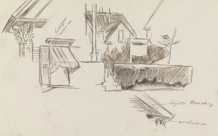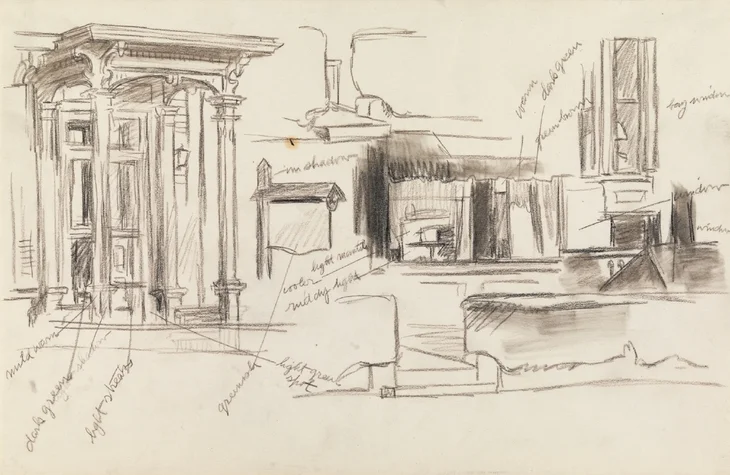 His sketches resemble architectural drafts and also include additional notes on how the light falls upon the building's faces. This method of labeling color and noting shadows and light can be seen in a multitude of studies for other paintings.