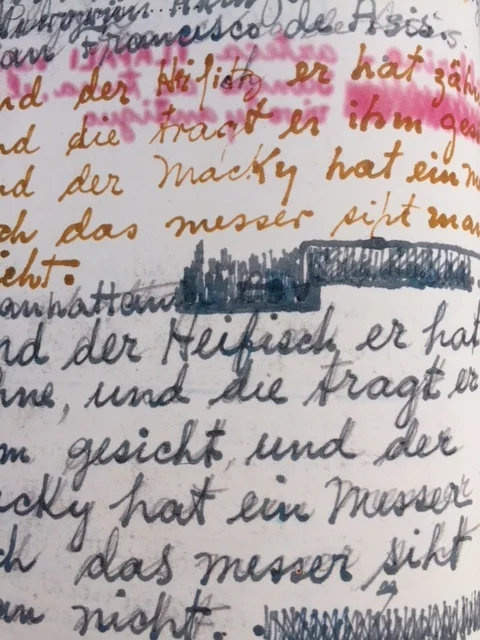 The pages carry an impasto-like quality in the layers of text, scratch-outs, and drawings. Verso appears through recto: splotches and writing seep through the page adding to the sense of all-consuming anguish.