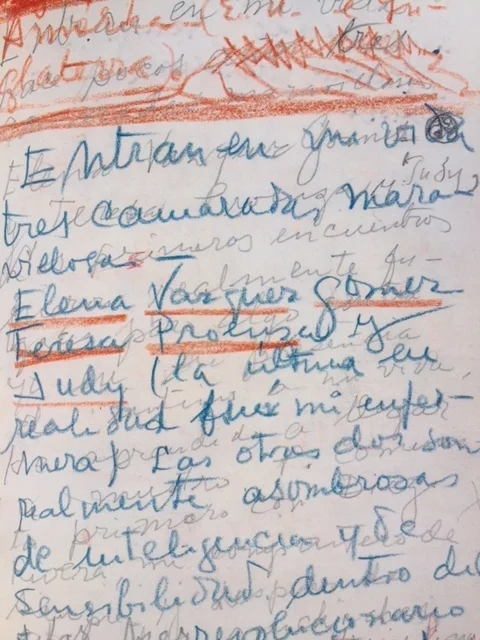 Below: The writing on the left is the second page of a letter written to Diego Rivera in her diary; it reveals ink marks from the drawing she creates on the back of the paper.