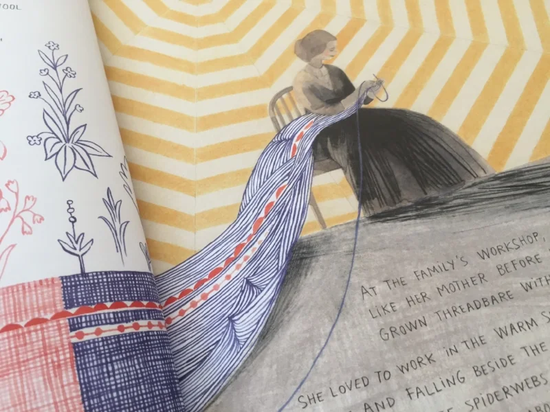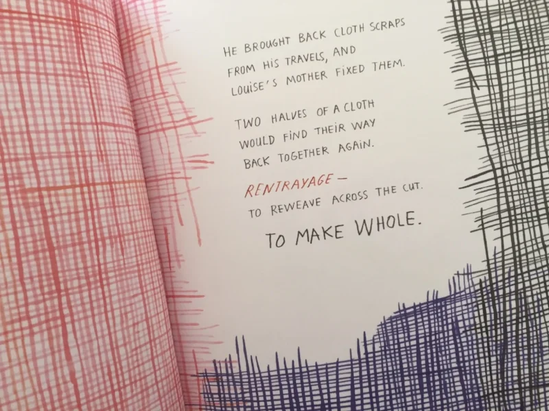 In Cloth Lullaby: The Woven Life of Louise Bourgeois, author Amy Novesky and illustrator Isabelle Arsenault create a textual and visual narrative of the life of Louise Bourgeois. True to the book's title, Bourgeois' own words and artwork are woven together to present a story of how life itself is its own creative endeavor.